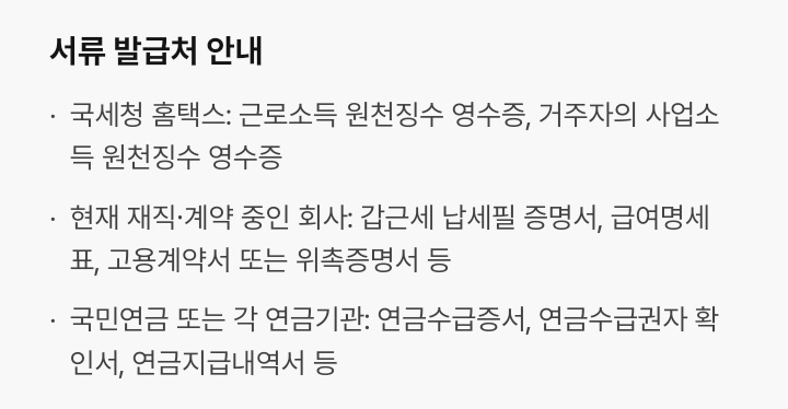 - 선택제출 서류는 갑종 근로소득 원천징수영수증, 갑근세 납세필수증명서 및 급여 명세표 중 소득을 증명할 수 있는 서류