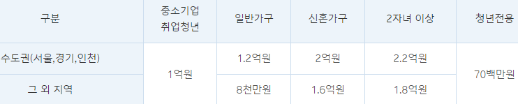 대출한도는 중소기업취업용 , 일반형, 신혼가구 전용 , 청년 전용 4가지로 각각 한도 및 금리가 다르며, 내용은 아래와 같습니다.