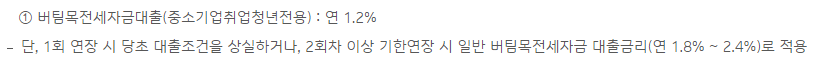 - 버팀목전세자금대출(중소기업취업청년전용) : 연 1.2%금리로 최대 1억원까지 가능합니다.
