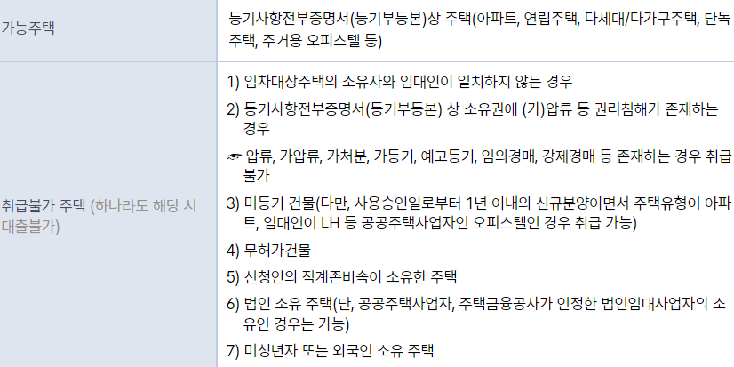 - 등기사항전부증명서(등기부등본) 상 용도가 주택으로 분류되는 건물만 대출이 가능하며, 주거용 오피스텔도 포함됩니다.