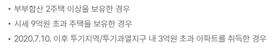 - 2020년 7월 10일 이후 투기지역 및 투기과열지구 내 시세 3억원 초과 아파트를 취득한 경우 대출 불가합니다.