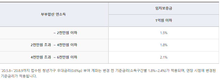 - 청년가구(만25세 미만 전용면적 60m2이하,보증금 7천만원이하,대출금 5천만원이하 단독세대주) 연 0.3%