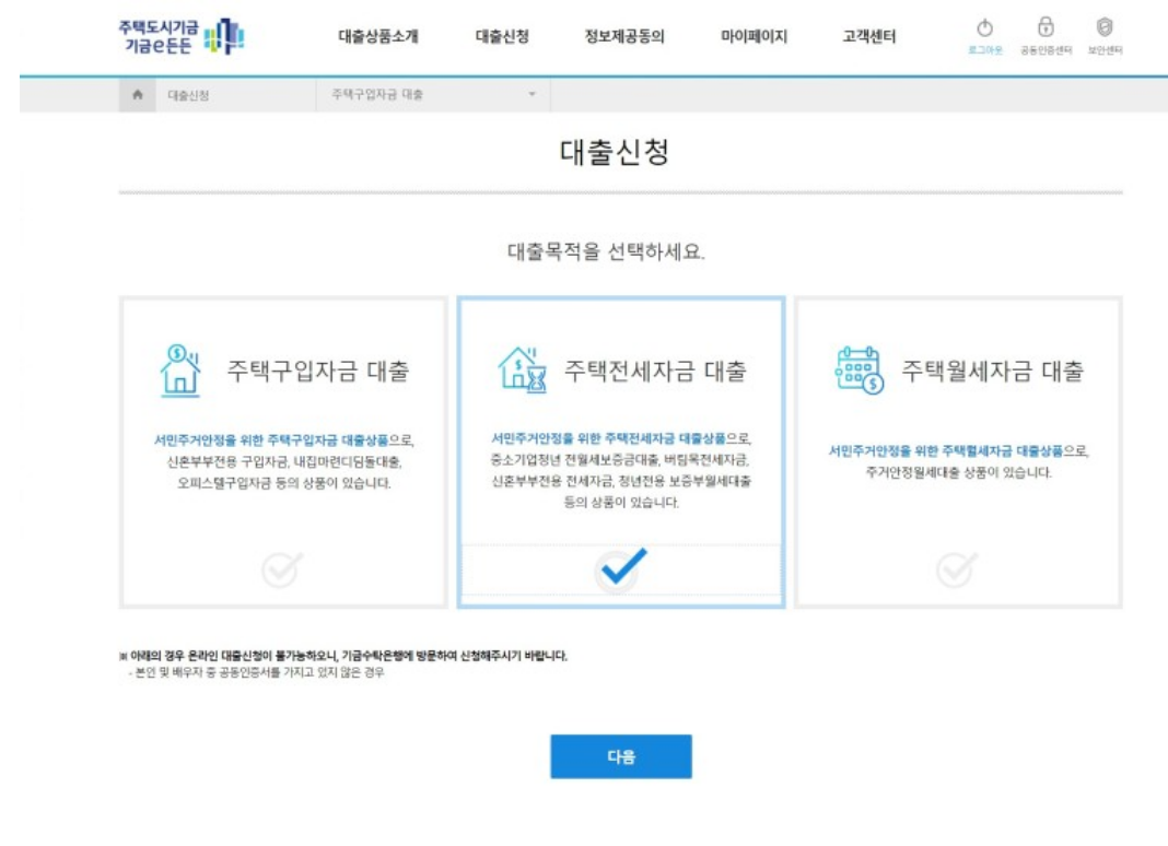 먼저 기금e든든 홈페이지에 들어가서 로그인하신 후 대출 신청란을 누르면 전세주택자금 대출을 선택하시고
