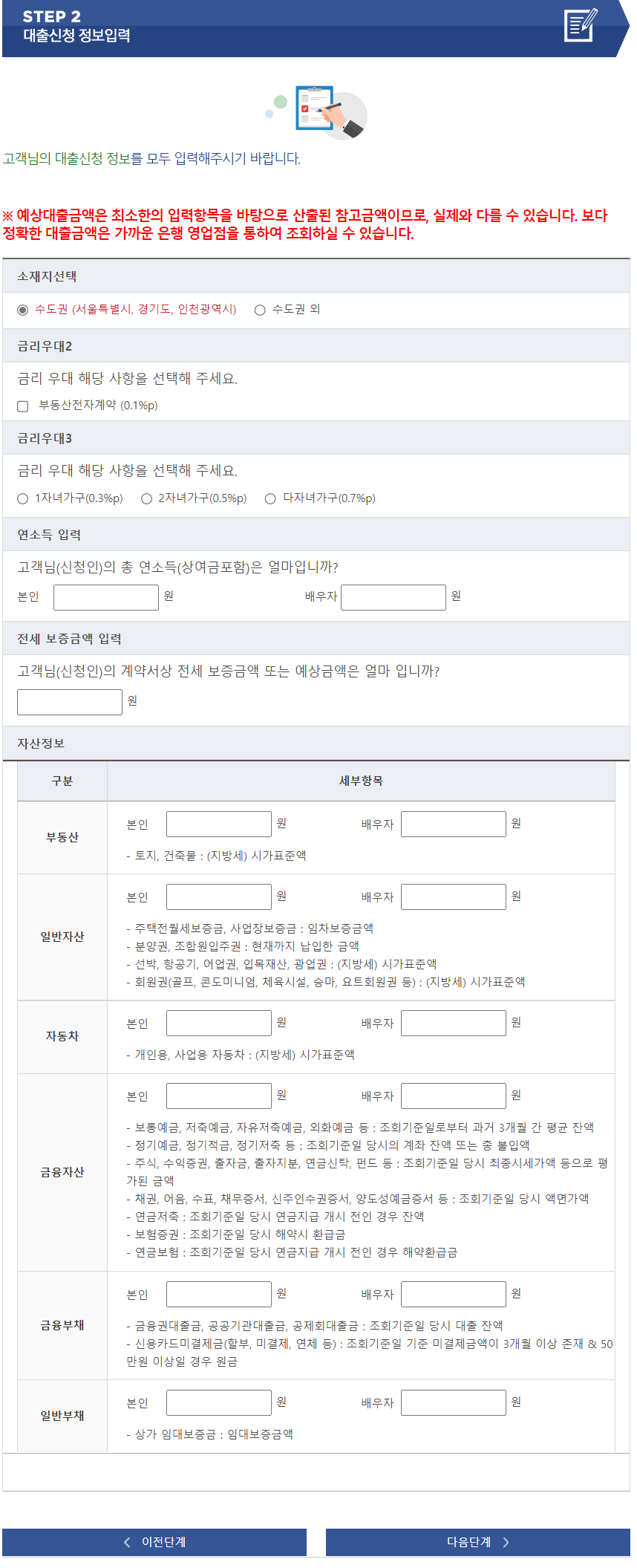 각 항목에 자신과 맞는 정보를 입력하고 다음 단계를 누르시면 예상 대출 금액과 금리가 산출됩니다.