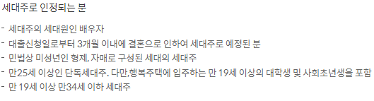 - 대출신청일 현재 민법상 성년인 세대주(단독 세대주 제외) 또는 세대주로 인정되는 분