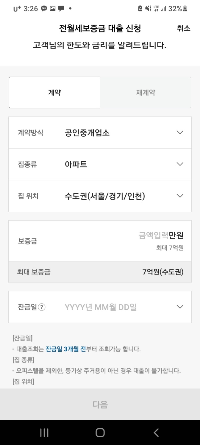 자신이 계약하는 주택의 정보를 입력, 계약방식, 주택 종류, 수도권 여부, 보증금 등을 입력 하고 다음