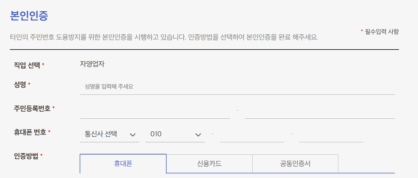 이후 휴대폰 본인인증을 진행합니다. 본인인증 수단은 휴대폰,신용카드,공동인증서가 있으며 저는 휴대폰으로 진행했습니다.