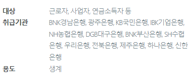 - 소득 요건 연솓그 3천5백만원 이하 또는 연소득이 4천5백만원 이하여도 신용평점 하위 20%이하여야 합니다.