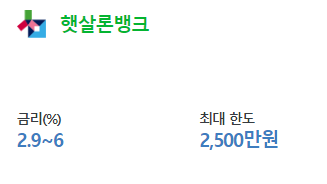대출한도는 올해까지 최대 2천5백만원의 한도로 빌릴 수 있으며, 대출 금리는 연 2.9 ~ 6%대 입니다.