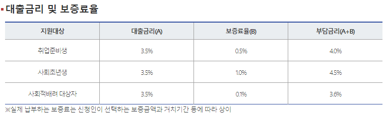 서민금융진흥원에서 보증을 해주기 때문에 보증료를 내야 하는데 보증료는 취업준비생일 경우 0.5%, 사회초년생일 경우 1%,사회적배려대상자일 경우 0.1%입니다.