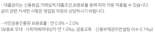 서민금융진흥원에서 보증을 서주기 때문에 보증료율이 붙으며 보증료율은 위 우대조건을 참고하시면 아낄 수 있습니다.