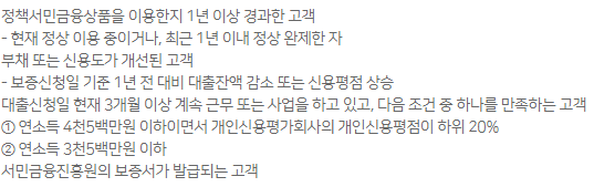 이 상품은 정책서민금융상품을 이용했던 고객을 제도권 금융 이용을 할 수 있도록 지원하는 징검다리 성격의 상품입니다.