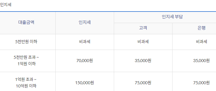 인지세란 대출거래 신규 약정 시 내는 세금으로 대출 금액에 따라 위와 같이 인지세가 적용되며 이 인지세는 은행과 고객이 각각 50%씩 부담하게 됩니다.