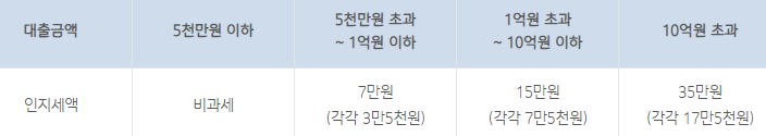 인지세는 대출거래 신규 약정 시 내는 세금으로 대출금액에 따라 위와 같이 세액이 정해지며 이 인지세는 은행과 고객이 각각 50%씩 부담하게 됩니다.