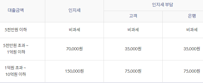 인지세란 대출 거래 약정 시 내는 세금으로 5천만원 이하까지는 비과세이며 대출 금액에 따라 위와 같이 인지세가 정해지며 이 인지세는 은행과 고객이 각각 50%씩 부담하게 됩니다.