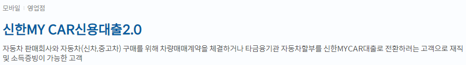 신한은행 앱인 신한 쏠 신청 후 로그인 한 뒤 금융상품몰에서 '신한 MY CAR 신용대출 2.0' 상품을 찾아 신청하시면 됩니다.