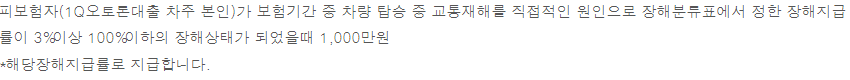 하나은행 1Q오토론을 이용하여 자동차를 구매한 고객이 만일 대출 실행일로부터 1년 이내에 아래 조건에 해당하는 교통사고로 본인 신체 상해 발생한 경우 보험혜택이 제공됩니다.