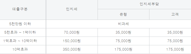 인지세란 대출거래 신규 약정 시에 내는 세금으로 대출금액에 따라 위와 같이 인지세가 책정되며 고객과 은행이 각각 50%씩 부담합니다.