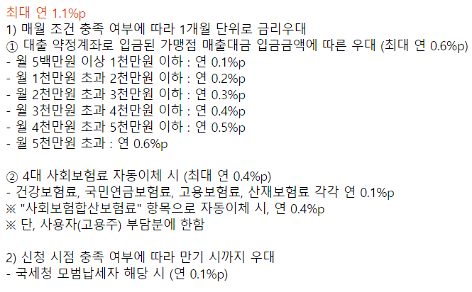 가맹점 매출대금 입금계좌를 우리은행으로 이용하고 아래의 기준을 모두 충족하는 분에 한하여 가능합니다.
