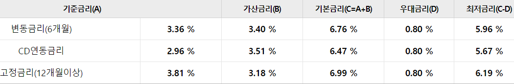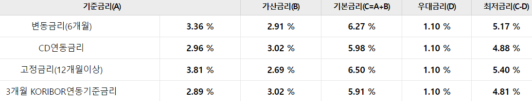 우대금리조건이 가맹점 매출대금 입금금액에 따라 달라지며 우리은행으로 가맹점 매출 대금 입금을 해놓지 않은 분들은 아래 개인사업자대출 TOP5를 확인하셔서 다른 조건 없이 빌려주는 곳을 참고하시는게 나을수도 있습니다.
