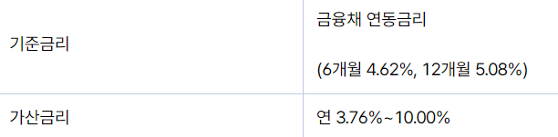 대출금리는 기준금리 + 가산금리를 적용하며 아래와 같습니다.