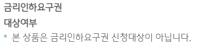 이 상품은 금리인하요구권 적용이 불가한 상품으로 금리인하요구권이란 자신의 신용상태 , 소득증가 ,부채감소, 취업 및 승진 등의 눈에 보이는 변화가 있다면 은행의 심사를 통해 금리 인하를 받을 수 있는 요구권이라고 보시면 됩니다.