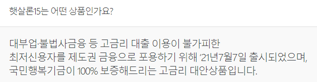 햇살론 15는 20% 이상 고금리 대출 이용이 불가피한 최저신용자에게 자금을 지원해주는 상품입니다.
