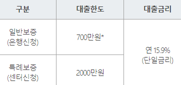 한도는 일반보증 또는 특례보증 신청할 때 대출한도가 아래와 같이 달라집니다.