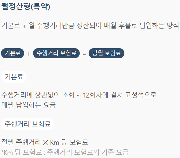 보험료 산정은 월정산형(특약) / 연납부 후 정산형(특약)으로 나누어져 있습니다.