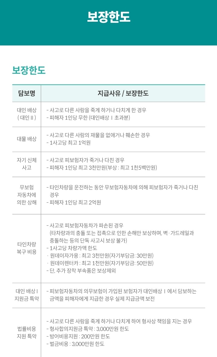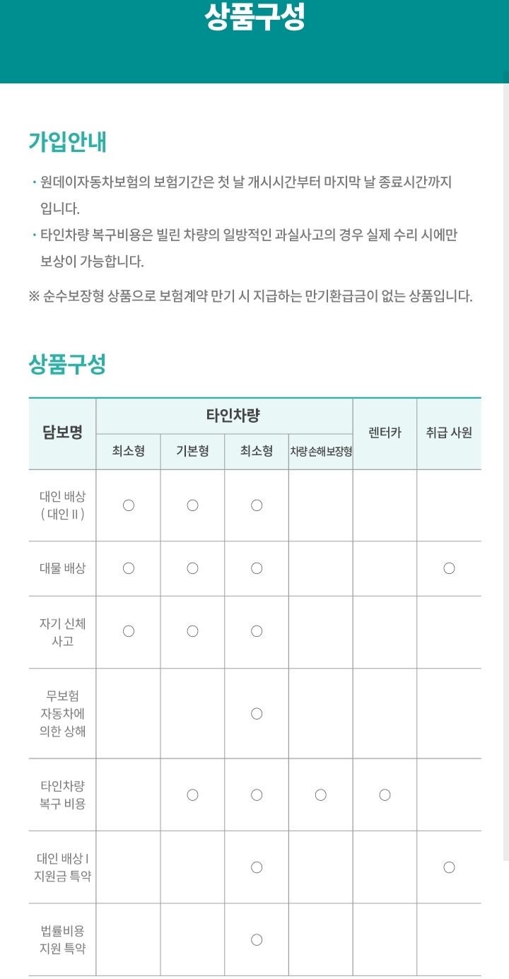 하나손해보험 원데이 자동차보험 보장 내용