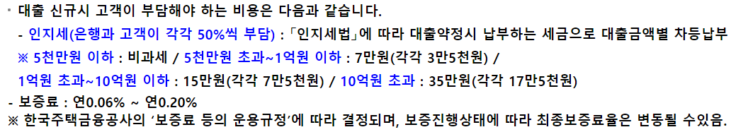 - 임차보증금의 80% 이내 개인의 주택금융공사 보증한도에 따라 차등 적용