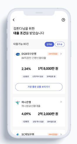 단 1분! 1금융권 포함 60여개 금융사의 200여개 대출을 쉽게 비교하고 신청해 보세요. 갖고 있는 대출도 편하게 관리 할 수 있어요. 편리하고 빠른 대출 조건 비교 - 신용점수 영향 없이 신용대출