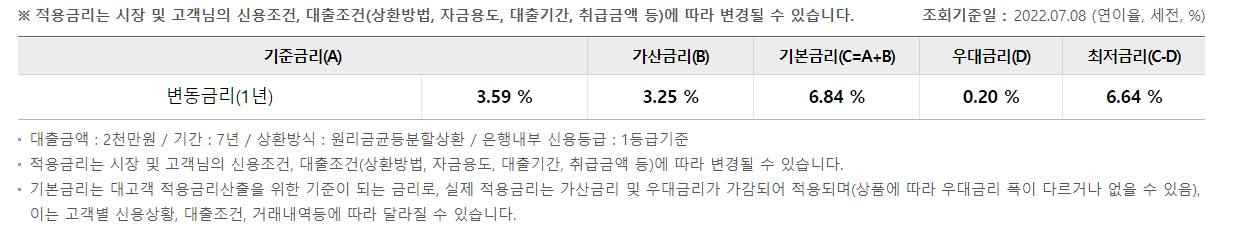 이 상품도 중도상환 수수료는 없으며, 우대금리 조건은 최고 연 0.1%까지만 가능한데 금융자산 정보 수집 이용 동의 시에 0.1% 금리 우대가 가능합니다.