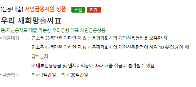 중/저 신용자도 대출 가능한 우리은행의 대표 서민금융지원 상품입니다. 이름은 비슷하지만 두 가지로 나뉘는데 우리 새희망홀씨 2 비대면 상품과 우리 새희망홀씨 II 상품으로 나뉩니다.
