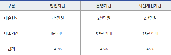 창업초기 운영자금 및 창업초기시설자금은 창업(예정)자 이면서 사업자 등록 후 6개월 미만인 분에 한해 대출한도를 각각 2천만원(신규대출 1천만원 + 미소금융 성실상환 시 추가 1천만원 지원 가능) 대출금리는 4.5%