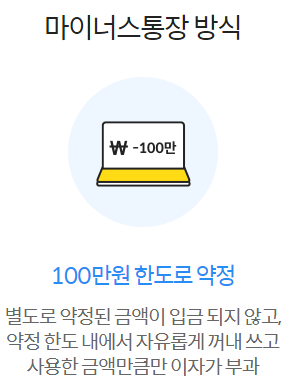 마이너스통장이란 대출기간 동안 한도 내에서 언제든 상환하고 재사용이 가능해 필요할 땐 쓰고 필요하지 않으면 갚아두어 이자비용을 줄일 수 있다는 장점이 있는 상환방식이며, 100만원 한도로 가능합니다.
