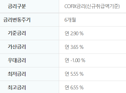 COFIX금리(신규취급액기준) = COFIX는 대출실행일 직전 영업일 전국은행연합회에 최종 고시되어 있는 신규취급액기준을 금리로 적용합니다.