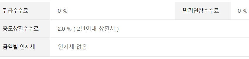 중도상환수수료는 말 그대로 약정한 대출 기간 보다 먼저 대출금액을 상환할 때내는 수수료로 2%입니다.