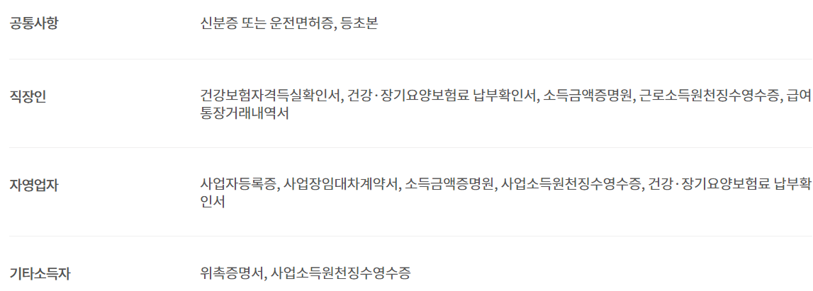 필요서류는 직장인,자영업자,기타소득자로 구분되어 아래와 같이 필요합니다.